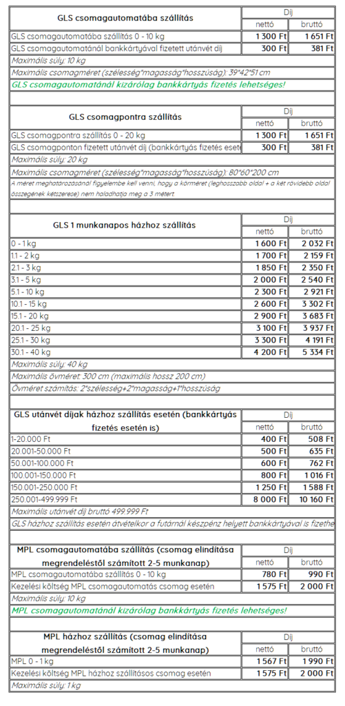 Eleget téve törvényi kötelezettségünknek webáruházunkban a GLS futárszolgálat mellett az MPL szolgáltatásait is ki tudják választani. MPL csomagok esetén további kezelési költséget számítunk fel!