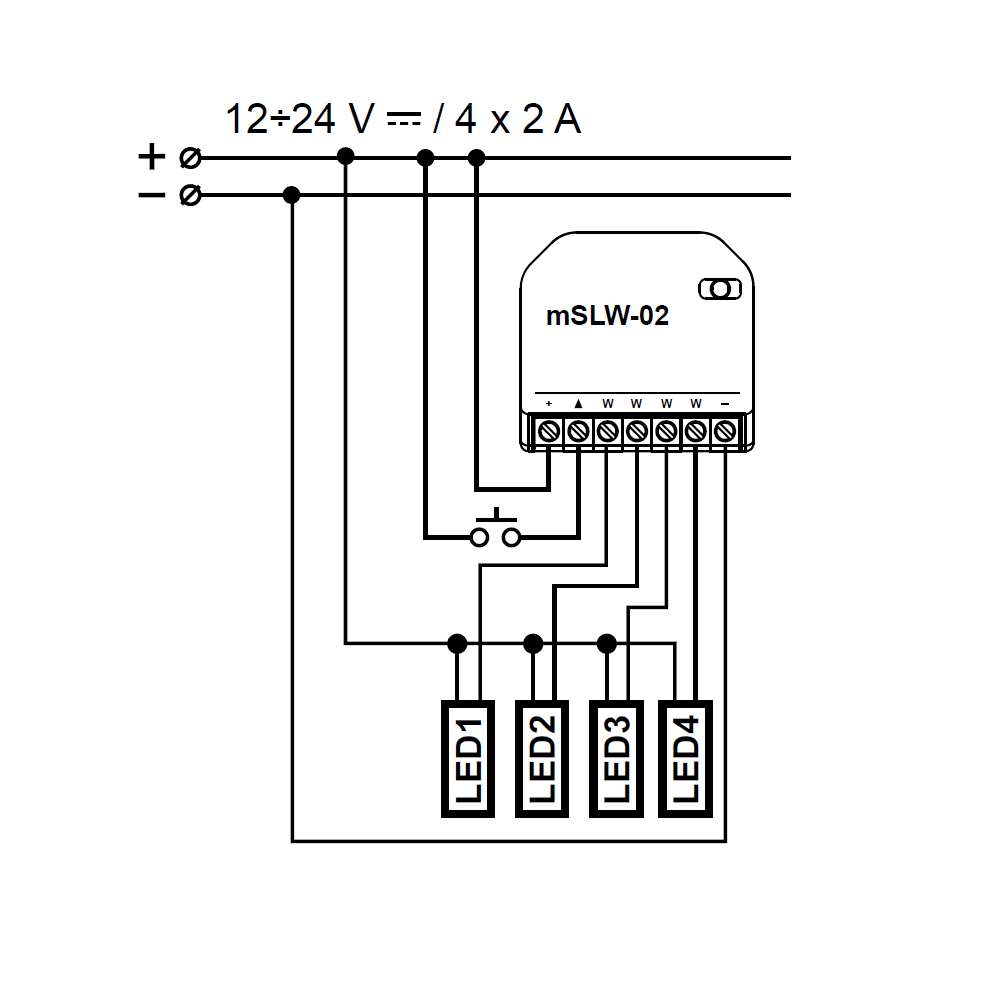- 1 nyomógomb bemenet be/ki kapcsoláshoz és fényerő szabályozáshoz